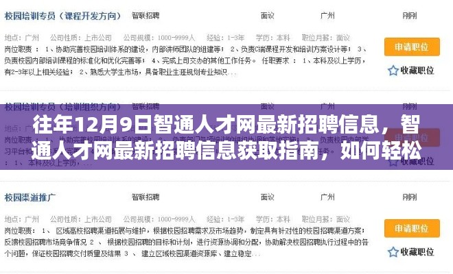 通过本文的详细步骤指南,无论是初学者还是进阶用户都能轻松掌握如何在智通人才网获取往年12月9日的最新招聘信息,在求职过程中,保持积极的心态和持续的努力是成功的关键,祝愿每位求职者都能找到满意的工作机会!